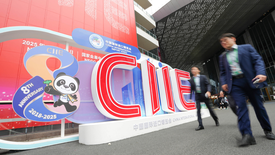 11月5日,人们从第八届进博会主题装饰前走过。新华社记者 任鹏飞 摄