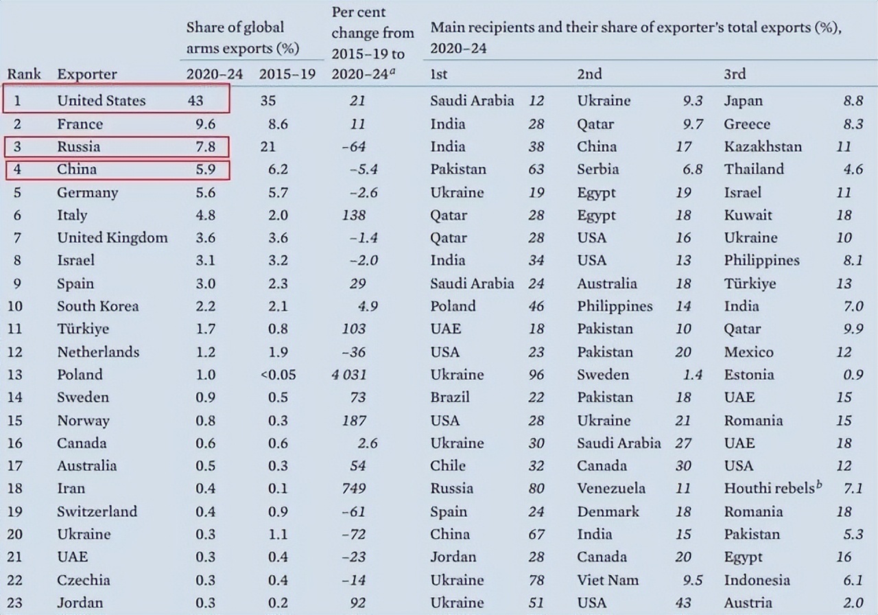 斯德哥尔摩国际和平研究所2025年3月10日报告,军火总出口额比上个五年期少了0.6%,但分布上头重脚轻,美国一家独大,其他国家跟不上趟儿。