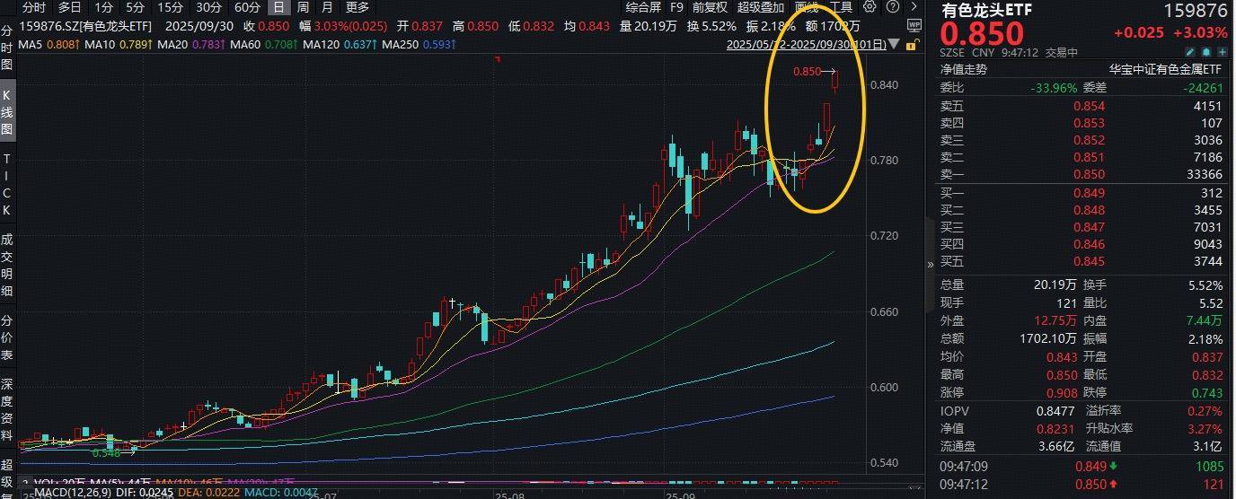 今日(9月30日)有色金属板块领涨两市,揽尽有色金属行业龙头的有色龙头ETF(159876)跳空大涨忆融速配,场内价格盘中涨超3%,创4年多新高,获资金实时净申购1440万份!